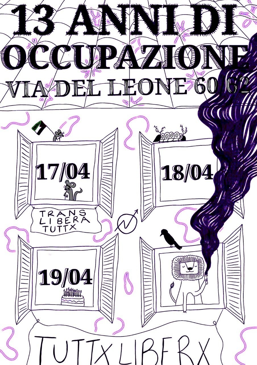 Presto uscirà il programma completo della tre giorni per celebrare il 13esimo anno di occupazione in cui ci incontreremo per laboratorie, presentazioni, momenti di piazza, cene, musica e giochi !