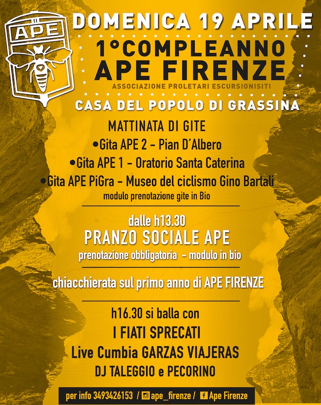 APE Firenze, Associazione Proletari Escursionisti festeggia il suo primo anno. in programma una mattinata di gite, un pranzo sociale e un pomeeriggio di danze!