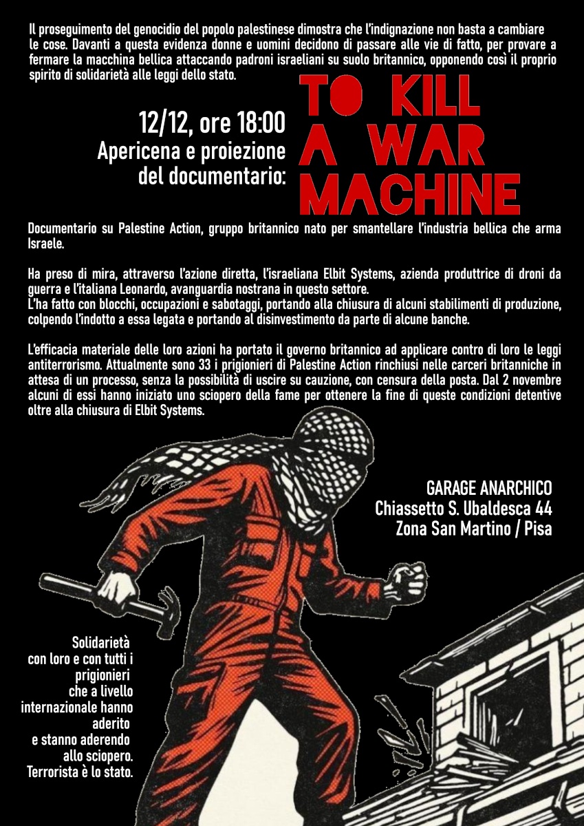 Documentario su Palestine Action, gruppo britannico nato per smantellare l’industria bellica che arma Israele. Ha preso di mira, attraverso l’azione diretta, l’israeliana Elbit Systems, azienda produttrice di droni da guerra e l’italiana Leonardo, avanguardia nostrana in questo settore. L’ha fatto con blocchi, occupazioni e sabotaggi, portando alla chiusura di alcuni stabilimenti di produzione, colpendo l’indotto a essa legata e portando al disinvestimento da parte di alcune banche.
