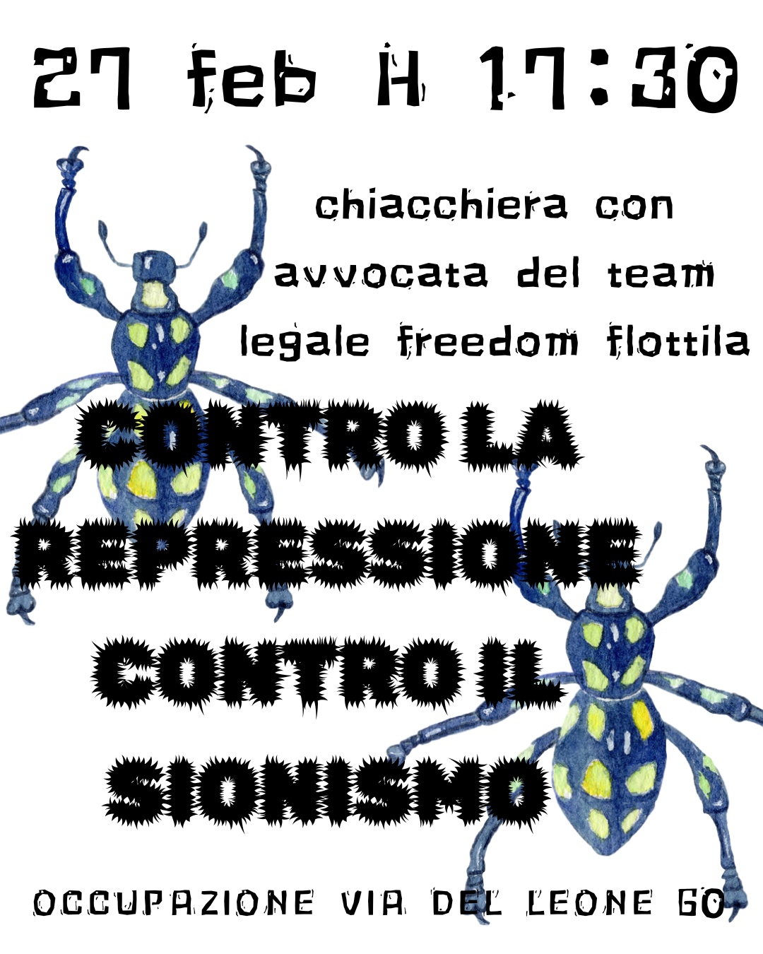 Ci vediamo il 27 febbraio alle 17:30 con un’avvocata del Team legale freedom Flotilla Italia e Centro di ricerca ed elaborazione per la democrazia. Parleremo delle mobilitazioni di questo autunno e dell’ondata repressiva che ha colpito varie realtà per uno scambio di pratiche di autodifesa legale. Alla fine si aprirà a dubbi e domande.