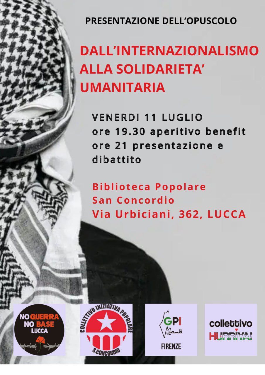 Ne parleremo VENERDI' 11 LUGLIO ALLE 21 CON IL COLLETTIVO HURRIYA! di Pisa E I GIOVANI PALESTINESI D'ITALIA di Firenze PRESSO LA BIBLIOTECA POPOLARE DI SAN CONCORDIO A LUCCA, ALLE 19.30 APERITIVO BENEFIT.