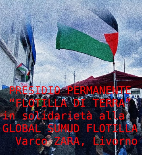 Siamo in presidio permanente al varco Zara in solidarietà con la Global Sumud Flotilla. Mercoledì 23 settembre il presidio è divenuto permanente occupando uno stabile in disuso accanto al Varco Zara del porto di Livorno.