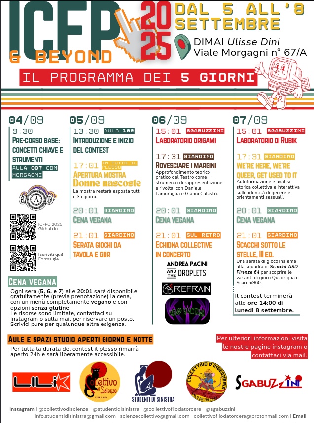 Torna al Dini la gara internazionale di informatica e matematica bandita dall'ICFP. Dal 5 all'8 settembre 2025 potrete fare parte della squadra Unifi e gareggiare con il resto del mondo. La partecipazione è aperta a tuttɜ, studenti, docenti, ricercatori e ricercatrici, personale tecnico-amministrativo e cittadinɜ.