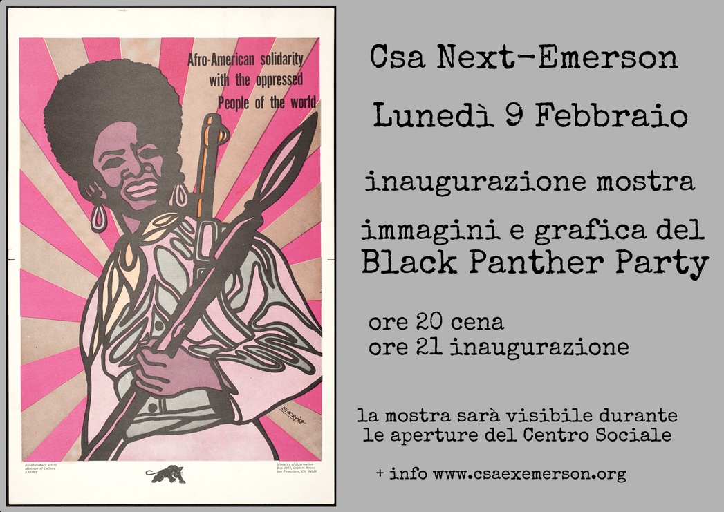 In occasione del Black History Month inaugurazione della mostra sulla grafica e le immagini del Black Panther Party. Foto, illustrazioni, prime pagine dell'organo di stampa delle Pantere Nere e un documentario girato nel periodo di attività del BPP