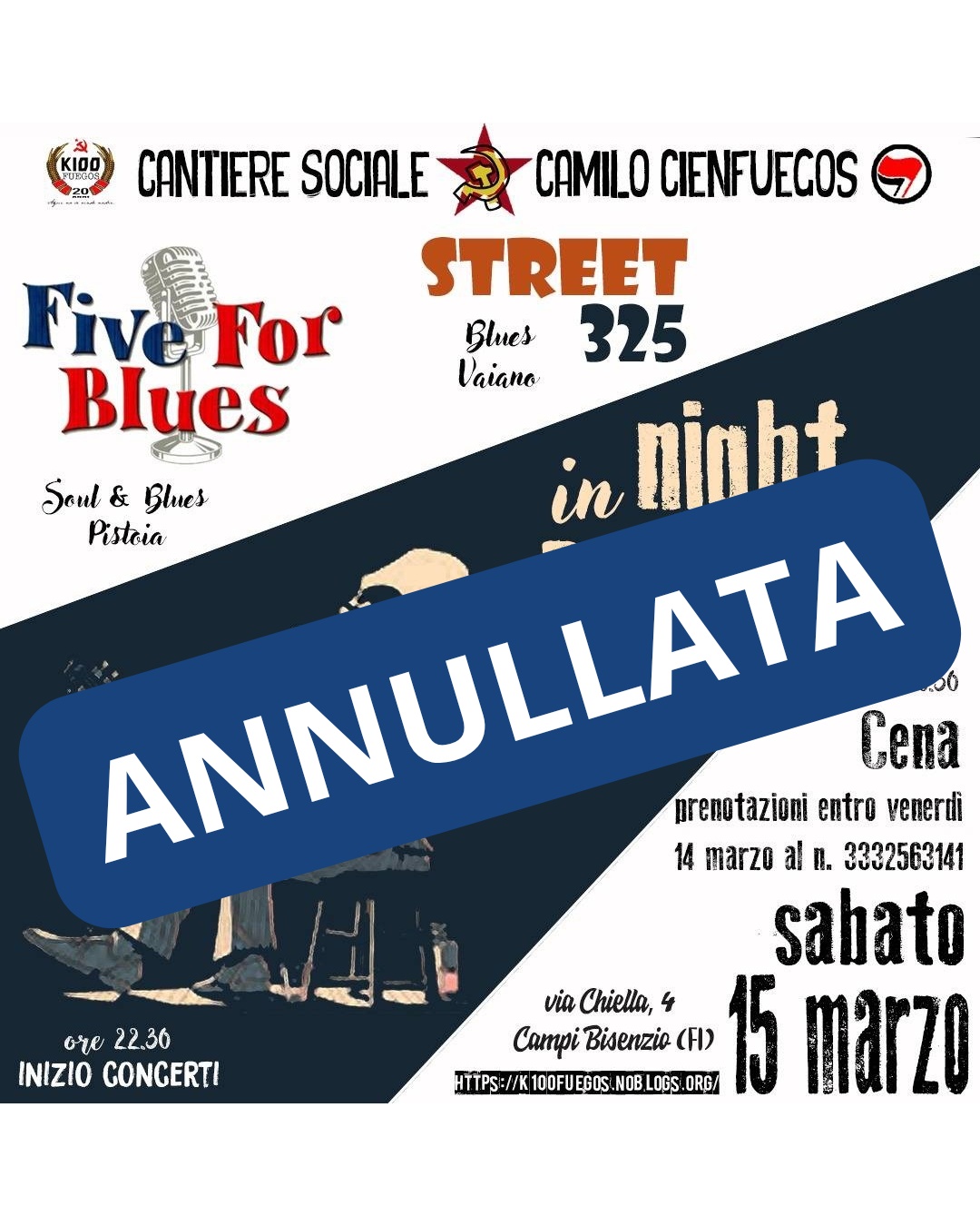 Causa maltempo e prolungamento dell'allerta rossa fino alla mezzanotte, ci vediamo costretti ad annullare la serata prevista per stasera.