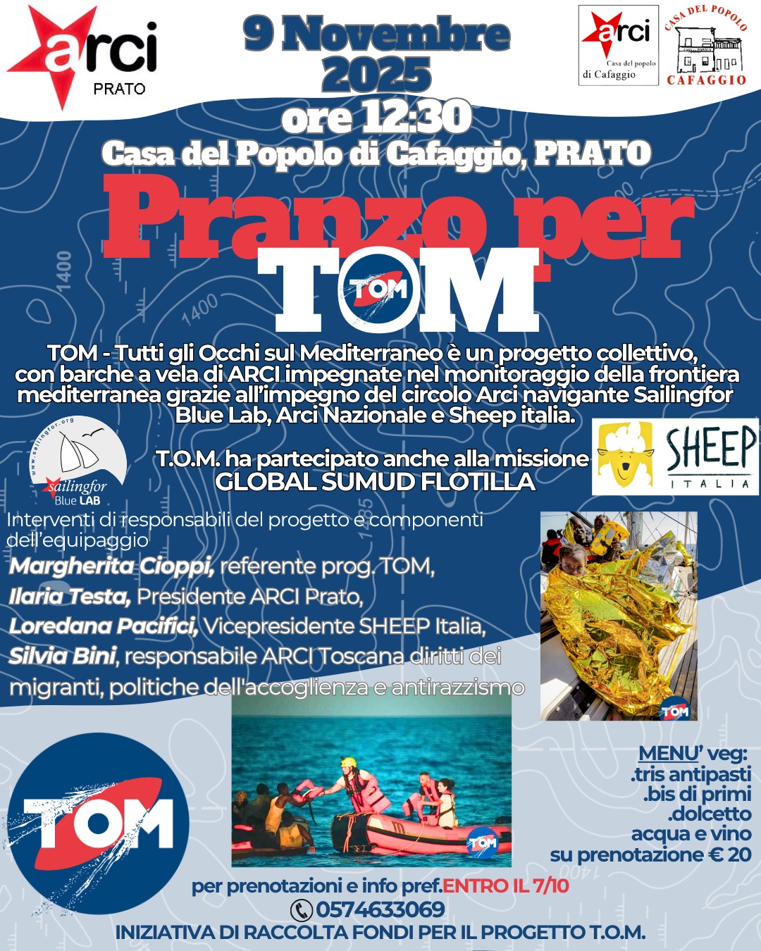 iniziativa di raccolta fondi per le missioni in zona SAR, promossa dal circolo ARCI della Casa del Popolo di Cafaggio insieme ad ARCI Prato, in collaborazione con le realtà promotrici del progetto TOM, come SHEEP Italia e Sailing for BlueLab.