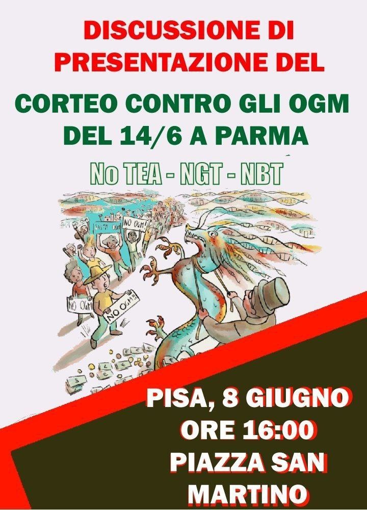 Con l'idea di condividere un ragionamento sulla agricoltura 4.0, le vecchie e nuove nocività e come si ripercuotono sulle nostre vite e sui territori da noi abitati ed in vista del corteo del 14 giugno a Parma, centro di una delle sperimentazioni di OGM in campo, ci vediamo in piazza a Pisa per parlarne insieme!