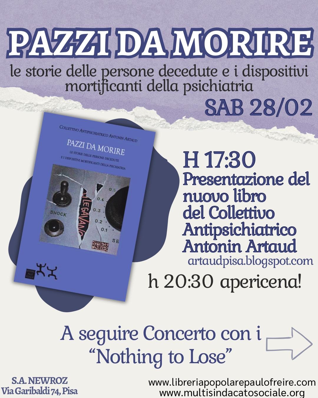 Presentazione del nuovo libro del Collettivo Antipsichiatrico Antonin Artaud “PAZZI DA MORIRE” - le storie delle persone decedute e i dispositivi mortificanti della psichiatria - .