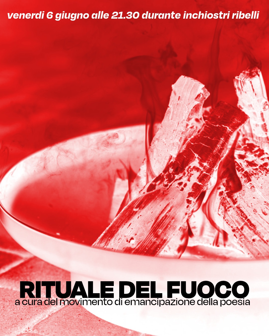 Il Movimento per l'emancipazione della Poesia si inserisce nel festival Inchiostri Ribelli con un rituale incentrato sull'elemento del fuoco. All’interno di un braciere lasceremo ardere alcune poesie. Dalla cenere ricavata andremo a creare un inchiostro parietale. Con esso l’artista Brucio darà forma materiale e visiva ad un’ulteriore poesia. L’evento sarà accompagnato dalla musica dell’artista Verdiana Raw. Nel frattempo lasceremo un microfono aperto: chiunque è invitato a leggere. Così la poesia, novella araba fenice, rinasce dalle proprie ceneri. Un miracolo e un mistero al contempo, capace di comprendere la dimensione comunitaria e individuale.