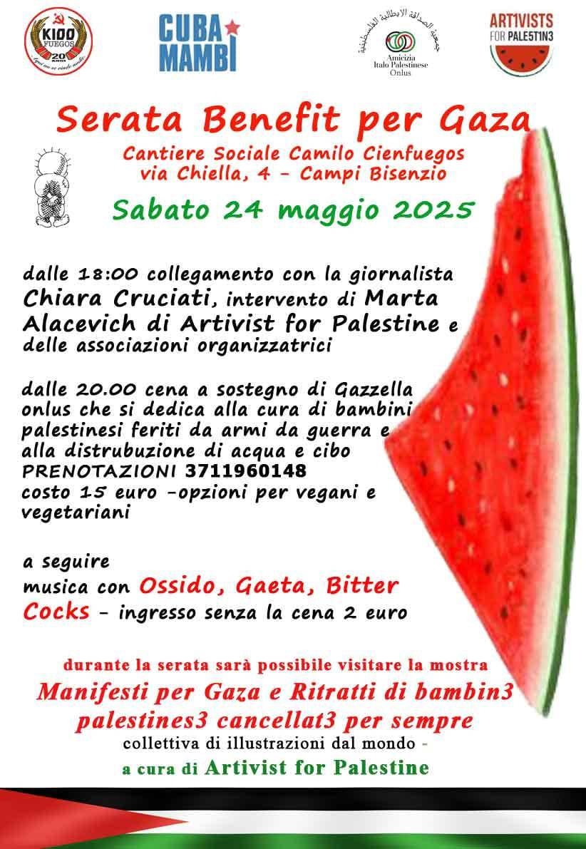 👉 Dalle 20.00 cena a sostegno di Gazzella Onlus che si dedica alla cura di bambini palestinesi feriti da armi da guerra e alla distribuzione di acqua e cibo