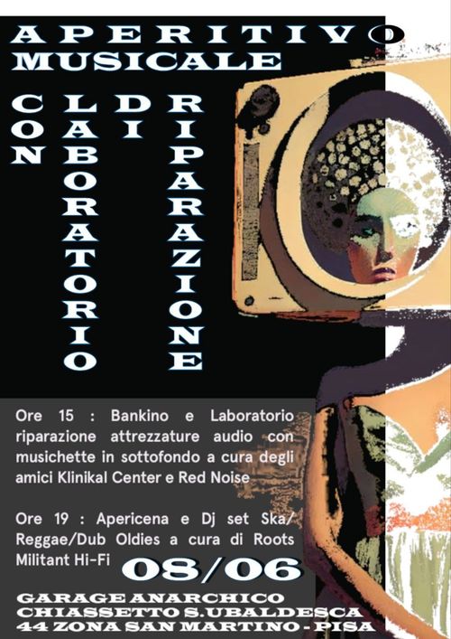 Aperitivo musicale con Laboratorio di riparazione domenica 08 giu, 15:00-23:00 domenica 8 giugno 23:00 Garage Anarchico Chiassetto S. Ubaldesca 44, Pisa Garage anarchicoKlinikal CenterPisaRed NoiseRoots Militant Hi-Fi