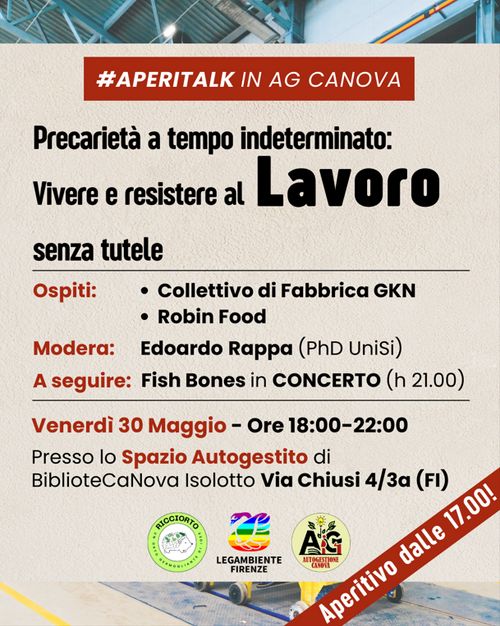 Talk "Precarietà a tempo indeterminato: Vivere e resistere al lavoro senza tutele" - Ciclo di AperiTalk in AG Canova venerdì 20 giu, 18:00-20:00 venerdì 20 giugno 20:00 Sala Autogestita della BiblioteCaNova Isolotto Via Chiusi 4/3 A, Firenze BASTA MORTI SUL LAVOROFirenzeGKNLavoro precarioagcanovaaperitalkinagcanova