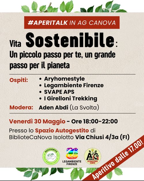 Talk "Vita sostenibile - Un piccolo passo per te, un grande passo per il pianeta" - Ciclo di AperiTalk in AG Canova sabato 05 lug, 18:00-20:00 sabato 5 luglio 20:00 Sala Autogestita della BiblioteCaNova Isolotto Via Chiusi 4/3 A, Firenze Cena socialeFirenzeViaggiagcanovaambienteaperitalkinagcanova